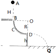 3、简答题 如图所示,竖直平面内的一半径R=0.5m的不光滑圆弧槽BCD,B点与圆心O等高,D点在圆心正下方.质量m=0.1Kg的小球从B点正上方H=0.8m高处的A点自由下落,由B点进入圆弧槽轨道,从D点水平飞出后落出后落在水平面上的Q点,DQ间的水平距离s=1.6m,D点距水平面的高度h=0.8m,g取10m/s2,不计空气阻力,求: