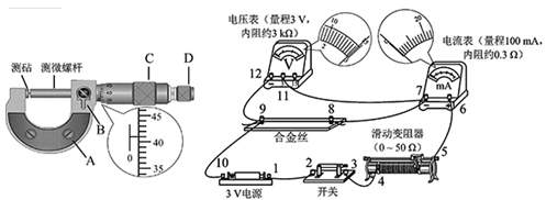(2)合上开关,将滑动变阻器的滑片移到最左端的过程中,发现电压表和电流表的指针只在图示位置发生很小的变化,说明电压表被串联在电路中,致使电流表读数很小,电压表读数接近电压电动势,因此电路中连接合金属丝的接线柱7、9之间部分应发生了断路