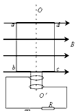 5、计算题 一正方形线圈在匀强磁场中绕OO’轴转动,线圈通过滑环与外电阻R连接成如图所示电路,安培表与伏特表均为理想交流电表,其中线圈匝数为N=200匝,边长为l=0.10m,线圈总电阻为r=1.0Ω,外电阻R=9.0Ω,匀强磁场B=0.50T,转速为n=3.0×103r/min,求: