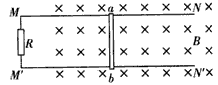 3、计算题 如图所示,平行光滑导轨MN和M"N"置于水平面内,导轨间距为l,电阻可以忽略不计,导轨的左端通过电阻忽略不计的导线接一阻值为R的定值电阻。金属棒ab垂直于导轨放置,其阻值也为R。导轨处于磁感应强度为B、方向竖直向下的匀强磁场中.当金属棒ab在导轨上以某一速度向右做匀速滑动时,定值电阻R两端的电压为U。