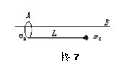 3、简答题 长为L的轻绳,一端用质量为m1的环套在水平光滑的固定横杆AB上,另一端连接一质量为m2的小球,开始时,提取小球并使绳子绷紧转到与横杆平行的位置(如图7)然后同时释放环和小球,当小球自由摆动到最低点时,小球受到绳子的弹力多大?
