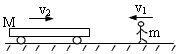 5、计算题 一辆小车在光滑的水平面上以v2=1m/s的速度向右运动,小车的质量为M=100kg,如图所示。一质量为m=50kg的人从小车的右端迎面跳上小车,接触小车前瞬间人的水平速度大小为v1=5.6m/s。求人跳上小车后,人和小车共同运动速度的大小和方向。