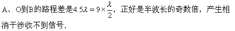 如图所示,广场上有一个半径R=45m的圆圈,AB是它的一条直径,在圆心O和圆周上的A点分别装有同样的电磁波源,它们发出的球面电磁波长λ=" 10" m.有一人站在B处用接收器恰好收不到信号,他沿圆周向A走,在走到A之前,他有几次收不到信号、有几次收到的信号最强?