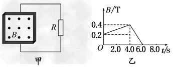 4、计算题 如图甲所示,在一个正方形金属线圈区域内,存在着磁感应强度B随时间变化的匀强磁场,磁场的方向与线圈平面垂直。金属线圈所围的面积S=200cm2,匝数n=1000,线圈电阻r=1.0Ω。线圈与电阻R构成闭合回路,电阻R=4.0Ω。匀强磁场的磁感应强度随时间变化的情况如图乙所示,求: