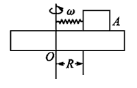 4、计算题 有一水平放置的圆盘,上面放有一劲度系数为k的弹簧,如图所示,弹簧的一端固定于轴O上,另一端挂 一质量为m的物体A,物体与盘面间的动摩擦因数为μ,开始时弹簧未发生形变,长度为R,求: