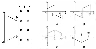 3、选择题 图中两条平行虚线之间存在匀强磁场,虚线间的距离为l,磁场方向垂直纸面向里,abcd是位于纸面内的梯形线圈,ad与bc间的距离也为l.t=0时刻,bc边与磁场区域边界重合(如图).现令线圈以恒定的速度v沿垂直于磁场区域边界的方向穿过磁场区域.取沿a→b→c→d→a的感应电流为正,则在线圈穿越磁场区域的过程中,感应电流I随时间t变化的图线可能是(? )