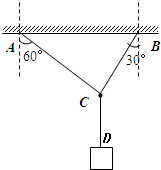 5、简答题 如图所示,用绳AC和BC吊起一个物体,绳AC与竖直方向的夹角为60°,能承受的最大拉力为100N,绳BC与竖直方向的夹角为30°能承受的最大拉力为150N.欲使两绳都不断,物体的重力不应超过多少?