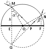 设在M点处,光的入射角为i,折射角为r,∠OMQ=α,∠PNF=β.根据题意有 α=30° ①