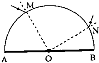 3、简答题 如图,一横截面为半圆柱形的透明物体,底面AOB镀银(图中粗线),O表示半圆截面的圆心,一束光线在横截面内从M点的入射角为30°,∠MOA=60°,∠NOB=30°.求: