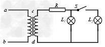 4、选择题 如图所示,理想变压器的原线圈a、b两端接正弦交流电压,副线圈c、d两端通过输电线接两只相同的灯泡L1、L2,输电线的等效电阻为R,当开关由原来的闭合状态变为断开时,下列各量中减小的是?
