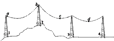 4、选择题 2008年1月份,我国南方大部分地区遭遇50年不遇的大雪灾,高压输电线路大面积受损,冻雨使输电线表面结冰,重力增大,导致线断塔倒。如图所示的四座铁塔,两塔之间的输电线长度相等,2号铁塔在山顶,1、3、4号铁塔在山下且等高,图中所