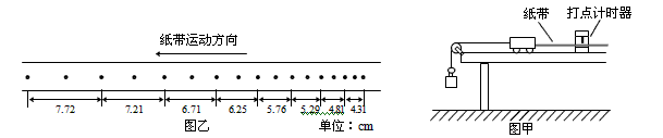 1、计算题 实验装置如图甲所示:一木块放在水平长木板上,左侧栓有一细软线,跨过固定在木板边缘的滑轮与一重物相连。木块右侧与打点计时器的纸带相连。在重物牵引下,木块在木板上向左运动,重物落地后,木块继续向左做匀减速运动,图乙给出了重物落地后,打点计时器在纸带上打出的一些点,试根据给出的数据,求木块与木板间的动摩擦因数μ。要求写出主要的运算过程。(打点计时器所用交流电频率为50Hz,不计纸带与木块间的拉力。重力加速度取g=10m/s2。)