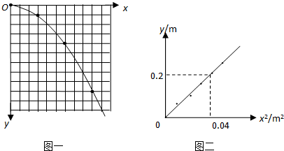 (4)该同学在轨迹上选取间距较大的几个点,测出其坐标,并在直角坐标系内绘出了y-x2图象如图二,则此平抛物体的初速度v0=______m/s(g=10m/s2).
