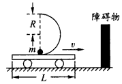 1、选择题 在一次探究活动中,某同学设计了如图所示的实验装置,将半径R=1 m的光滑半圆弧轨道固定在质量M=0.5 kg、长L=4m的小车上表面中点位置,半圆弧轨道下端与小车的上表面水平相切,现让位于轨道最低点的质量m=0.1 kg的光滑小球随同小车一起沿光滑水平面向右做匀速直线运动。某时刻小车碰到障碍物而瞬时处于静止状态(小车不反弹),之后小球离开圆弧轨道最高点并恰好落在小车的左端边沿处,该同学通过这次实验得到了如下结论,其中正确的是(g取10m/s2)