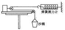 4、实验题 如图所示是测量物块与木板间的动摩擦因数的实验装置。物块放在长木板上,木板固定在水平桌面上,物块前方装有轻质小滑轮,沙桶和弹簧测力计通过绕在滑轮上的细绳相连,放开沙桶后,物块在木板上做匀加速直线运动。(板上面空间的细绳均水平,不计滑轮的摩擦)
