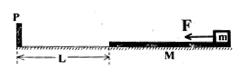 4、计算题 (20分)光滑水平面上有一质量为M="2" kg的足够长的木板,木板上最右端有一大小可忽略、质量为m=3kg的物块,物块与木板间的动摩擦因数,且最大静摩擦力等于滑动摩擦力。开始时物块和木板都静止,距木板左端L=2.4m处有一固定在水平面上的竖直弹性挡板P。现对物块施加一水平向左外力F=6N,若木板与挡板P发生撞击时间极短,并且搏击时无动能损失,物块始终未能与挡板相撞,求: