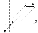 4、选择题 如图所示,S为静止的点光源,M为与竖直方向成θ角的平面镜,若平面镜在水平方向做振幅为A的简谐振动(平动),则光源S在平面镜中的虚像点S′(图中未画出)的运动情况是(?)