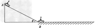 3、计算题 如图所示,在游乐场的滑冰道上有甲、乙两位同学坐在冰车上进行游戏。当甲同学从倾角为θ=30°的光滑斜面冰道顶端A自静止开始自由下滑时,与此同时在斜面底部B处的乙同学通过冰钎作用于冰面从静止开始沿光滑的水平冰道向右做匀加速运动。设甲同学在整个运动过程中无机械能变化,两人在运动过程中可视为质点,则