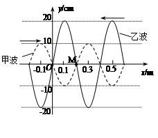 3、选择题 如图为甲、乙两列简谐横波在同一绳上传播时某时刻的波形图,甲波向右传播,乙波向左传播。质点M位于x=0.2m处,则( )