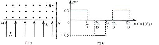 的速度通过MN进入其上方的匀强磁场,磁场与纸面垂直,磁感应强度B按图b所示规律周期性变化(图b中磁场以垂直纸面向外为正,以电荷第一次通过MN时为t=0时刻).计算结果可用π表示。