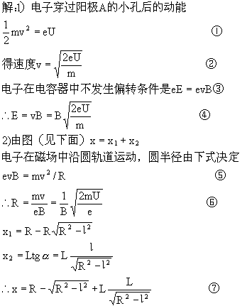 5、简答题 下面是一个电子射线管,由热阴极K发出的电子被阳极A与阴极K间的电场加速,从阳极A上的小孔穿出的电子束经过平行板电容器射向荧光屏.设A、K间的电势差为U,电子自阴极发出时的初速度可不计,电容器两板间除有电场外,还有一匀强磁场,磁感强度大小为B,方向垂直纸面向外,极板宽为 l ,如图所示: