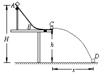 2、计算题  如图所示,轨道ABC被竖直地固定在水平桌面上,A距离水平地面高H=0.75 m,C距离水平地面高h=0.45 m。一质量m=0.10kg的小物块自A点从静止开始下滑,从C点以水平速度飞出后落在水平地面上的D点。现测得C、D两点的水平距离为x=0.60 m。不计空气阻力,取g=10 m/s2。求: