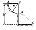 4、计算题 如图所示,位于竖直平面上的1/4圆弧光滑轨道,半径为R,OB沿竖直方向,圆弧轨道上端A点距地面高度为H,质量为m的小球从A点静止释放(球达B点水平速度大小等于球由O点自由释放至B点速度大小),最后落在地面C处,不计空气阻力,(g=10 m/s2)求: