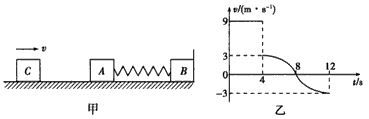 2、计算题 如图甲所示,物块A、B的质量分别是mA=4.0 kg和mB=3.0 kg,用轻弹簧拴接放在光滑的水平地面上,物块B右侧与竖直墙相接触。另有一物块C从t=0时以一定速度向右运动,在=4 s时与物块A相碰,并立即与A粘在一起不再分开,物块C的v-t图像如图乙所示。求: