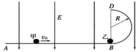 1、计算题 如图,ABD为竖直平面内的光滑绝缘轨道,其中AB段是水平的,BD段为半径R=0.2 m的半圆,两段轨道相切于B点,整个轨道处在竖直向下的匀强电场中,场强大小E=5.0×103 V/m。一不带电的绝缘小球甲,以速度υ0沿水平轨道向右运动,与静止在B点带正电的小球乙发生弹性碰撞。已知甲、乙两球的质量均为m=1.0×10-2 kg,乙所带电荷量q=2.0×10-5 C,g取10 m/s2。(水平轨道足够长,甲、乙两球可视为质点,整个运动过程无电荷转移)