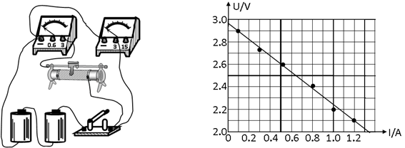 (2)图(乙)中的6个点表示实验中测得的6组电流I、电压U的值,按照这些实验值作出U—I图线,由此图线求得的电源电动势E = ?v, 内电阻r = ?Ω.(结果保留小数点后两位数字)