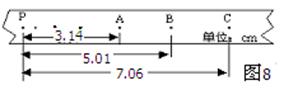 3、实验题 做《验证机械能守恒定律》的实验中,纸带上打出的点(打点计时器所用交流电的频率为50Hz)如图8所示,若重物的质量为m千克,图中点P为打点计时器打出的第一个点,则从起点P到打下点B的过程中,重物的重力势能的减小量ΔEP=?J,重物的动能的增加量ΔEK=?J。(g=9.8m/s2,小数点后面保留两位)?
