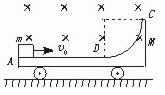 设此小车速度为v2,金属块由 A-D过程中系统动量守恒则:mv0 = mv1 +Mv2(1分)?∴v2 =" 1.0" m/s(1分)