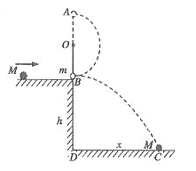 3、计算题 如图所示,O点为固定转轴,把一个长度为L的细绳上端固定在O点,细绳下端系一个质量为m的小摆球,当小摆球处于静止状态时恰好与平台的右端点B点接触,但无压力。一个质量为M的小钢球沿着光滑的平台自左向右运动到B点时与静止的小摆球m发生正碰,碰撞后摆球在绳的约束下作圆周运动,且恰好能够经过最高点A,而小钢球M做平抛运动落在水平地面上的C点。测得B、C两点间的水平距离DC=x,平台的高度为h,不计空气阻力,本地的重力加速度为g,请计算:
