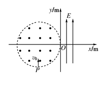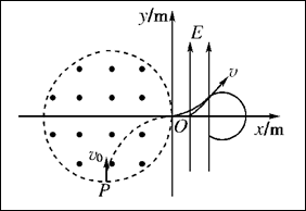 4、计算题 (13分)在如图所示的平面直角坐标系中,存在一个半径R=0.2 m的圆形匀强磁场区域,磁感应强度B=1.0 T,方向垂直纸面向外,该磁场区域的右边缘与y坐标轴相切于原点O点.y轴右侧存在电场强度大小为E=1.0×104 N/C的匀强电场,方向沿y轴正方向,电场区域宽度l=0.1 m.现从坐标为?(-0.2 m,-0.2 m?)的P点发射出质量m=2.0×10-9 kg、带电荷量q=5.0×10-5 C的带正电粒子,沿y轴正方向射入匀强磁场,速度大小v0=5.0×103 m/s.(粒子重力不计).