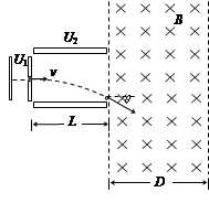 3、计算题 (13分)如图所示,一带电微粒质量为m=2.0×10-11kg、电荷量q=+1.0×10-5C(重力不计),从静止开始经电压为U1=100V的电场加速后,水平进入两平行金属板间的偏转电场中,微粒射出电场时的偏转角θ=30?,并接着进入一个方向垂直纸面向里、宽度为D=34.6cm的匀强磁场区域。已知偏转电场中金属板长L=20cm,两板间距d=17.3cm。(注意:计算中?取1.73)