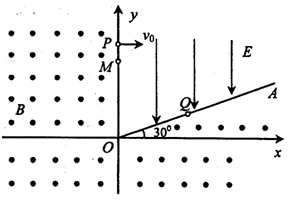 4、计算题 (16分)如图所示,在xoy平面直角坐标系的第一象限有射线OA,OA与x轴正方向夹角为30°,OA与y轴所夹区域内有沿y轴负方向的匀强电场,其他区域存在垂直于坐标平面向外的匀强磁场。有一质量为m、电量为q的带正电粒子,从y轴上的P点沿着x轴正方向以初速度v0射入电场,运动一段时间后经过Q点垂直于射线OA进入磁场,经磁场偏转,过y轴正半轴上的M点再次垂直进入匀强电场。已知OP=h,不计粒子重力,求:
