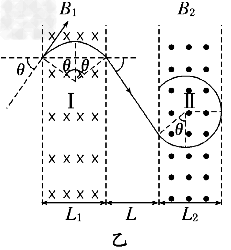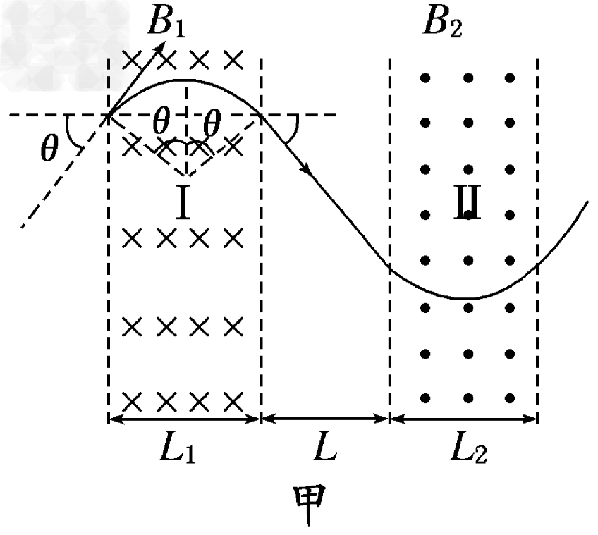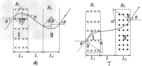 (4)若B1≠B2、L1≠L2,且已保证了粒子能从Ⅱ区右边界射出。为使粒子从Ⅱ区右边界射出的方向与从Ⅰ区左边界射入的方向总相同,求B1、B2、L1、L2之间应满足的关系式。