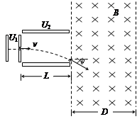 5、计算题 (12分)如图所示,一带电微粒质量为m=2.0×10-11kg、电荷量q=+1.0×10-5C,从静止开始经电压为U1=100V的电场加速后,水平进入两平行金属板间的偏转电场中,微粒射出电场时的偏转角θ=30?,并接着进入一个方向垂直纸面向里、宽度为D=34.6cm的匀强磁场区域。已知偏转电场中金属板长L=20cm,两板间距d=17.3cm,重力忽略不计。