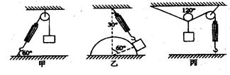 4、选择题 图中弹簧秤、绳和滑轮的质量均不计,绳与滑轮间的摩擦力不计,物体的重力都是G,在图甲、乙、丙三种情况下,弹簧秤的读数分别是F1、F2、F3,则