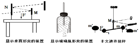 本题解析:桌面在压力的作用下发生微小的形变,通过光的反射放大,玻璃瓶在压力的作用下发生微小的形变,通过细管中的液体柱放大,引力大小仍是借助于光的反射来放大,故B正确;A、C、D错误。