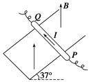 1、计算题  (10分)如图所示,在倾角为37°的光滑斜面上水平放置一条长为0.2 m的直导线PQ,两端以很软的导线通入5 A的电流.当加一个竖直向上的B=0.6 T的匀强磁场时,PQ恰好平衡,则导线PQ的重力为多少?(sin 37°=0.6)
