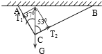 4、计算题 用绳AC和BC吊起一重物处于静止状态,AC与竖直方向成370,BC与竖直方向成530,如图所示.若AC绳能承受的最大拉力为150 N,BC绳能承受的最大拉力为105 N,与重物相连的绳非常牢固,求要使得绳AC与BC均不断裂,重物的最大质量为多少?(g=10N/kg,sin37°=0.6,cos37°=0.8)