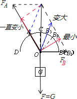 结点O始终处于平衡状态,所以OB绳和OA绳上的拉力的合力大小保持不变,方向始终是竖直向上的.故答案为:OA绳受力大小变化情况:变小;OB绳受力大小变化情况是:先变小后变大