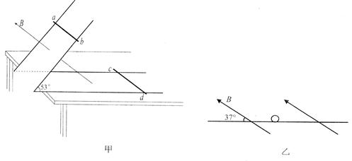 1、计算题 如图甲所示,固定在水平桌边上的“ ”型平行金属导轨足够长,倾角为53º,间距L=2m,电阻不计;导轨上两根金属棒ab、cd的阻值分别为R1=2Ω,R2=4Ω,cd棒质量m1=1.0kg,ab与导轨间摩擦不计,cd与导轨间的动摩擦因数μ=0.5,设最大静摩擦力等于滑动摩擦力,整个导轨置于磁感应强度B=5T、方向垂直倾斜导轨平面向上的匀强磁场中。现让ab棒从导轨上某处由静止释放,当它刚要滑出导轨时,cd棒刚要开始滑动;g取10m/s2,sin37 º ="cos53" º =0.6,cos37 º =" sin53" º =0.8。