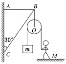 2、计算题  如图所示,轻杆BC的C点用光滑铰链与墙壁固定,杆的B点通过水平细绳AB使杆与竖直墙壁保持30°的夹角。若在B点悬挂一个定滑轮(不计重力),某人用它提起重物,使重物以加速度2m/s2向上做匀加速运动。已知重物的质量m=10kg,人的质量M=50kg,g取10m/s2。试求: