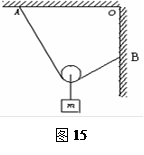 4、计算题 (10分)如图15所示,将一条轻而柔软的细绳一端固定在天花板上的A点,另一端固定在竖直墙上的B点,A和B到O点的距离相等,绳长为OA的两倍.滑轮的大小与质量均可忽略,滑轮下悬挂一质量为m的重物.设摩擦力可忽略,求平衡时绳所受的拉力为多大?
