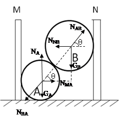 3、计算题 (10分) 如图所示,M、N为固定在光滑水平地面上的两块光滑竖直挡板,两板间叠放着A、B两个等长的光滑圆柱体. 已知圆柱体A的底面半径为2m, 圆柱体B的底面半径为3m,M、N两板间的距离为8m. 圆柱体A对M挡板的压力为12N, 圆柱体A的质量为1kg. 求:(1)圆柱体A对圆柱体B的支持力的方向与水平方向的夹角为多少度?(2)圆柱体A对地面的压力为多少?(g取10m/s2)