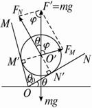 根据题意知,挡板NO的支持力FN等于球的重力mg,即FN=mg;图中所示的FN与FM的合力F′与重力mg构成平衡力,即F′=mg,所以力的三角形O′FNF′是等腰三角形,根据几何关系和已知条件得: