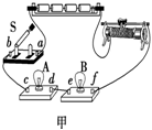 2、实验题 在如图甲所示的电路中,四节干电池串联,小灯泡A、B的规格为“3.8 V,0.3 A”.合上开关S后,无论怎样移动滑动片,A、B灯都不亮.