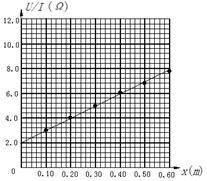 2、实验题 (10分)某同学为测定某电源的电动势E和内阻r以及一段电阻丝的电阻率ρ,设计了如图(a)所示的电路。ab是一段电阻率较大的粗细均匀的电阻丝,R0是阻值为2Ω的保护电阻,滑动片P与电阻丝接触始终良好。实验时闭合电键,调节P的位置,将aP长度x和对应的电压U、电流I数据记录如下表: